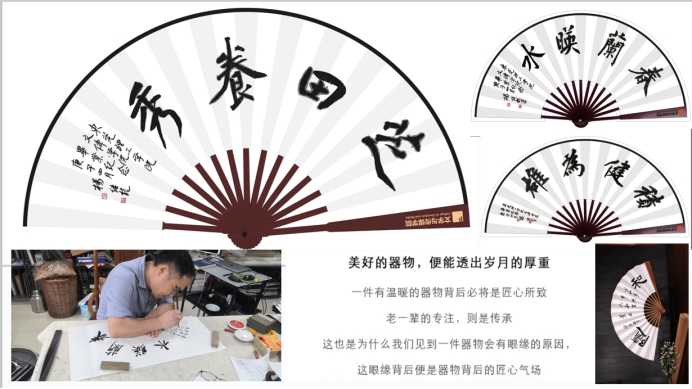 方案确定后,杨继龙老师负责扇面书法内容的遴选和书写,精心创作了“芝田养秀”、“积健为雄”、“春兰映水”等三幅极具文化内涵的扇面书法,经再三斟酌,最后采用“芝田养秀”,寓意太阳成集团tyc234cc古天乐是培养人才的沃土,也寄望文传学子自信、自立、自强,成长为社会和国家的栋梁之才;陈昱甫老师负责书法内容扫描抠像,融入太阳成集团tyc234cc古天乐元素设计扇子效果图;邓强老师联系扇子经营商生产制作。在公司党委的大力支持下,文产教工党支部迅速行动,整个工作由方案确定到设计、制作,前后仅用了5天时间。
