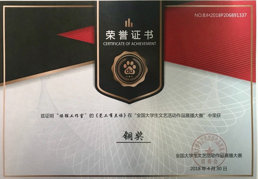 2018年5月6日,太阳成集团tyc234cc古天乐2016级广播电视学2班的黄晓杰、 吴嘉文同学拍摄的剧情片《星期狗日记》和张校华、洪晓鑫等同学创作的系列短片《莞工有点燥》以及《燥我说》栏目从五千多部全国高校老员工参赛作品中脱颖而出,分别荣获全国老员工文艺活动作品展播大赛的铜奖。同时,杨金山老师、蔡晓航老师获得优秀教师指导证书。